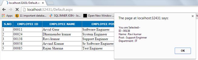 In the preceding code, I'm changing the row color on mouse over and doing the same to re-assign the old background color upon mouse out and a click to show the details in an alert.