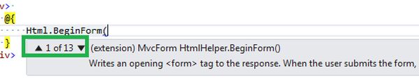 To create a HTML form, we can use the BeginForm() and EndForm() extension methods of the HTML helper class. The BeginForm has 13 overloaded versions that accept various parameters as needed. In the following screen, we have highlighted the number of overloaded functions.