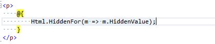 The hidden field we can create using a HiddenFor() extension method and the example is as in the following, it's pointing to the HiddenValue property of the Model class.