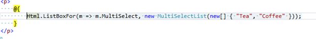 We can implement a Multi-select list using a ListBoxFor() extension method of HTML helper function. The implementation is as in the following.