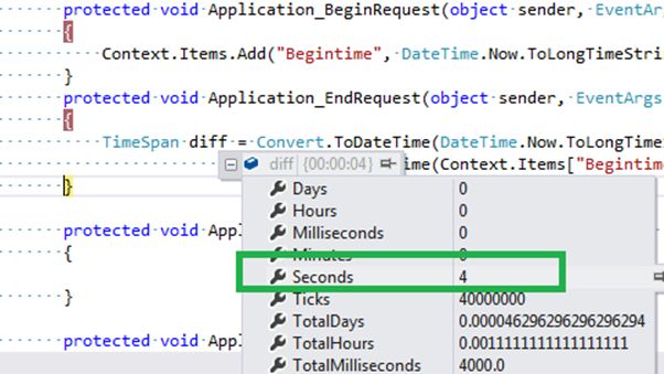 This will be our first operation to check the uses of the HttpContext class. In the global.aspx page we know that a BeginRequest() and EndRequest() is executed every time before any Http request. In those events we will set a value to the context object and will detect the request processing time. Here is a sample example.
