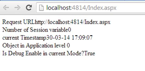 Response.Write("Request URL"+ HttpContext.Current.Request.Url) Response.Write("Number of Session variable" + HttpContext.Current.Session.Count);