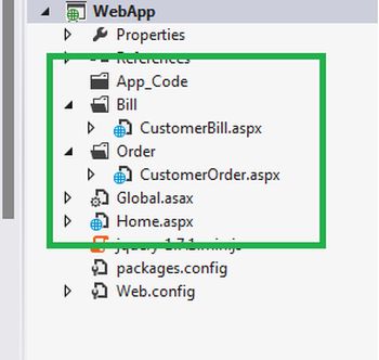 So, let’s create one Web Form application to implement the concept. Here I have created one project structure where I have created two directories called “Bill” and “Order” and kept two .aspx files in both of them. Depending on the route URL the .aspx file will be executed that we will see shortly.