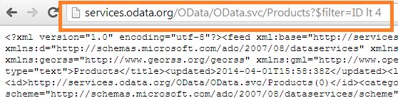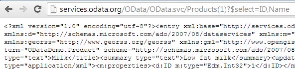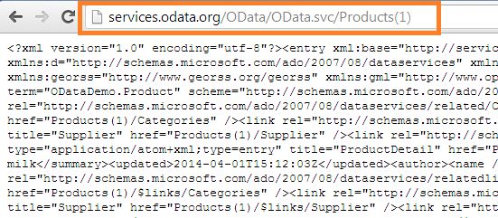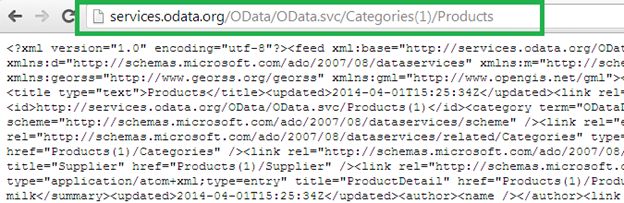 services.odata.ProductsThe URL is saying that we are interested in getting the first category from the Product main category. Here is output in XML format.