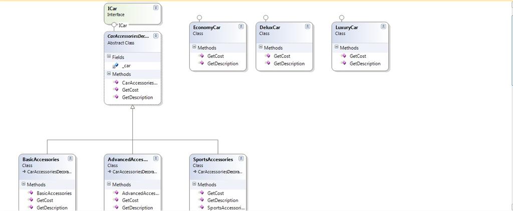 - CarAccessoriesDecorator objAccessoriesDecorator = new BasicAccessories(objCar);