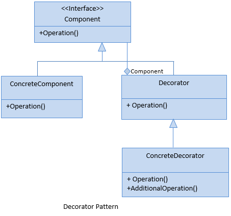 - Component: It defines the interface of the actual object that needs functionality to be added dynamically to the ConcreteComponents.