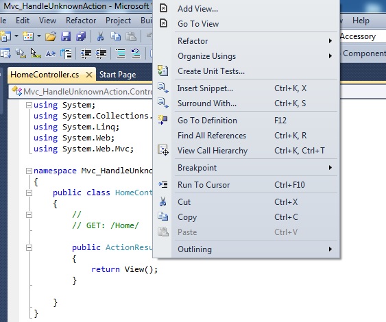 Open HomeController.cs and right-click on the HomeController's Index Action method.