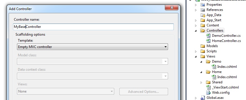 To avoid that we need to create another controller that overrides HandleUnknownAction. Right-click on the "Controller" folder in Solution Explorer yhen select Add then click on Controller. Name it "MyBaseController". Inside that class remove the index action method and add the following method.