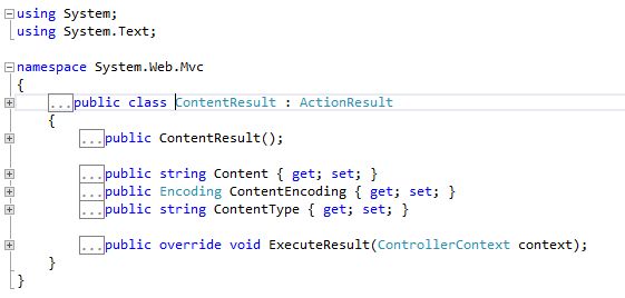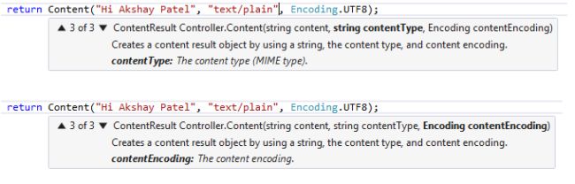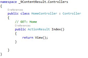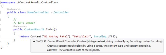 In this article we will see how to use content results in a controller in MVC.Step 1Create a MVC project from the "Empty" template.Right-click on "Controllers" and select "Add" >> "Controller...".Step 2Select "MVC 5 Controller - Empty" to add an empty controller.Click on the "Add" button.Step 3Name the controller as in the following:And it will add an action result method in the controller.Step 4ContentResult represents a user-defined content type. It is inherited from ActionResult. ContentResult has the following three properties:Content that we want to render on browserContentEncoding that defines the encoding of the contentContentType that informs the browser about the content like "text/plain", "text/html", "application/json" and so on.Here the ContentResult method returns an object of ContentResult. In the first parameter we pass the content that we want to render on the browser. The second parameter is of ContentType and the third one is content encoding.Step 5Run the project and you will see, content is rendered in the browser<< Day 8 Day 10 >>