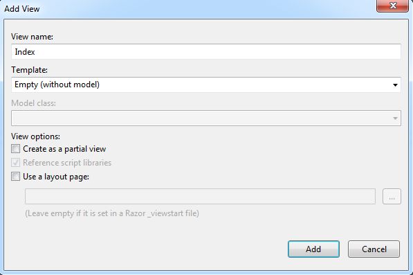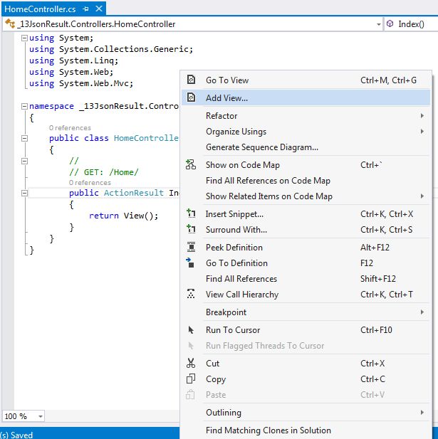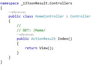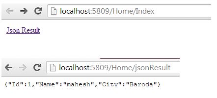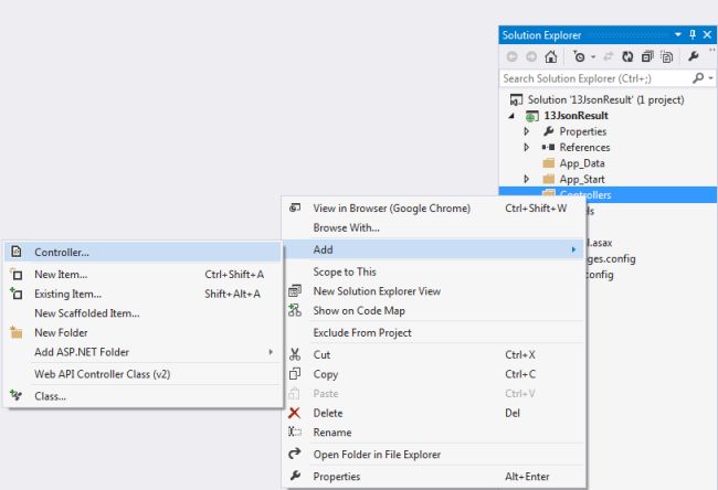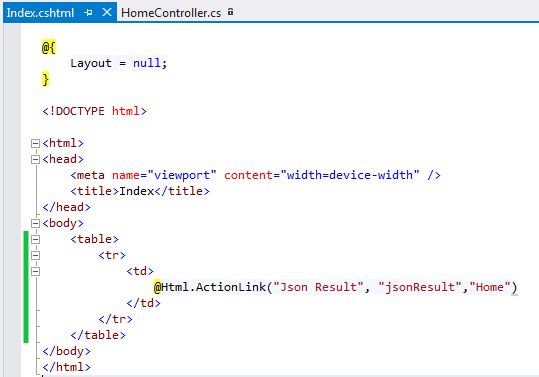 IntroductionThis article shows how to use a JSON result in a controller in MVC.Step 1Create a MVC project from the "Empty" template.Right-click on "Controllers" and select "Add" >> "Controller...".Step 2Select "MVC 5 Controller - Empty" to add an empty controller.Click on the "Add" button.Step 3Name the controller as in the following:And it will add an action result method to the controller.Step 4Now we need to create a view.Right-click on "Index" and select "Add View...".Step 5Name the view and select "Empty (without model)" as the template.Click on the "Add" button.Step 6Add a title in the index page.Step 7JsonResult is used to send JSON formatted content to the response. Create an object of employee inside the jsonresult method and return a jsonresult object. Commented code represents another way to create a jsonresult object. Step 8Create a link to call the "jsonResult" method in index.cshtml.Step 9Run the project, click on the "JsonResult" link and you can see the JSON data rendered on the browser.