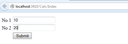 Here we use the HTML <form> element on the page, not a form with runat=server. The action attribute of the form element is set to post data to the add action method of the Calc controller. When we press the submit button, the post will be done. Once it is submitted, from the controller end we get data from the request.