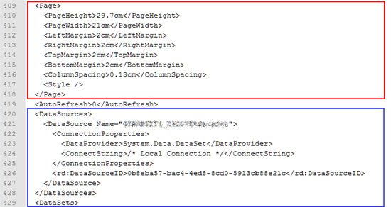 An RDLC file that defines a Local Report, is a simple XML formatted file and, as such, it could be opened with a text editor. If we open our newly created Report1.rdlc, we will see that everything we could graphically do on our report will have an XML transposition, but that is true even for the data section. In the following two images we can observe some interesting tags about data presentation. In the first one, we can see a "DataSources" section, in which our DataSet will be shown with its properties. In the second image, there are tags dedicated to the DataSet schema, the connection (that will be saved in the application's configuration file) and some tags named "Fields", used to specify each field name, type, data member name and so on.