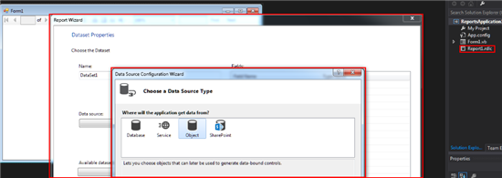 Confirming to proceed with it will cause the IDE to a) create a Form on which resides a ReportViewer, b) create a Report1.rdlc, that is the graphical-rendered part of our report and c) start a wizard to connect to a Data Source, selecting the objects that will become a part of the business logic of our application. The following image shows the first page of the wizard.