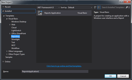 Open Visual Studio, select "New Project", then "Visual Basic" » "Reporting". We could see in the following image that there's a template named "Reports Application".