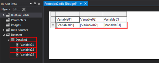 No connections, no schemas and a "fake" DataSet named DataSet1 that contains three fields named, respectively, Variable01, Variable02 and Variable03. To keep things easier, let's assume they are all of System.String type (but you could change it depending on your needs). The interesting thing is that it will continue to be a perfectly formatted RDLC file, in other words Visual Studio will open it.