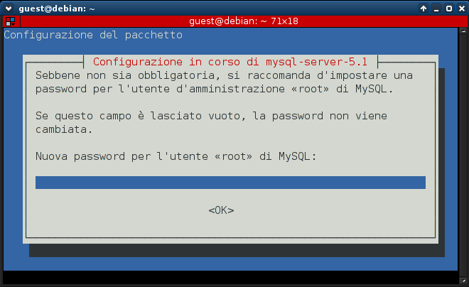 Pressing "Enter", the setup will start. The only information it will require is a password for the user root in MySQL (the following screenshot is in Italian, but its pretty self-explanatory. Let's just enter a password we will use later).