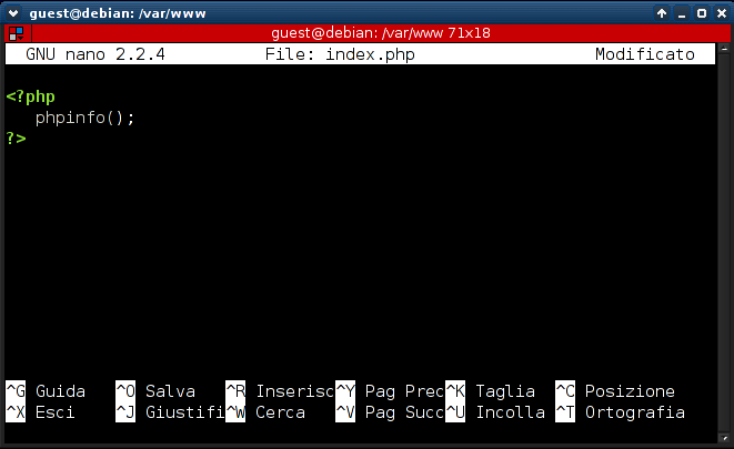 Then exit and save by pressing Ctrl + X, confirming the intent to write changes to the disk. What we've done here is simply to call the phpinfo() function that will provide us a list of the status of every parameter configured.