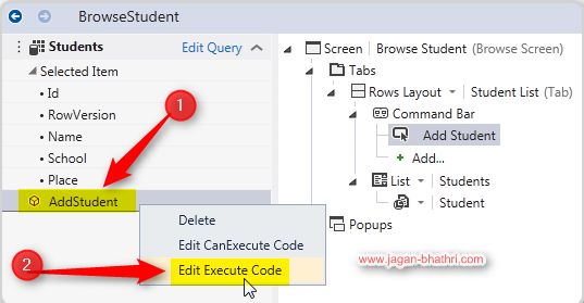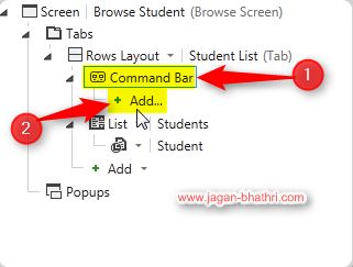 Now we need to add a button in the Command Bar, to pop-up a screen to add the new Student.