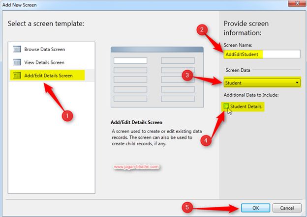 Now, a dialog box will pop-up. Select the Add/Edit Details Screen template from the left panel and name the screen as shown above. Ensure that you have unchecked the Student Details [1] checkbox as shown.