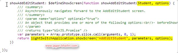 The showAddEditStudent function is generated automatically by the LightSwitch core framework on the fly in the viewmodel.js file.