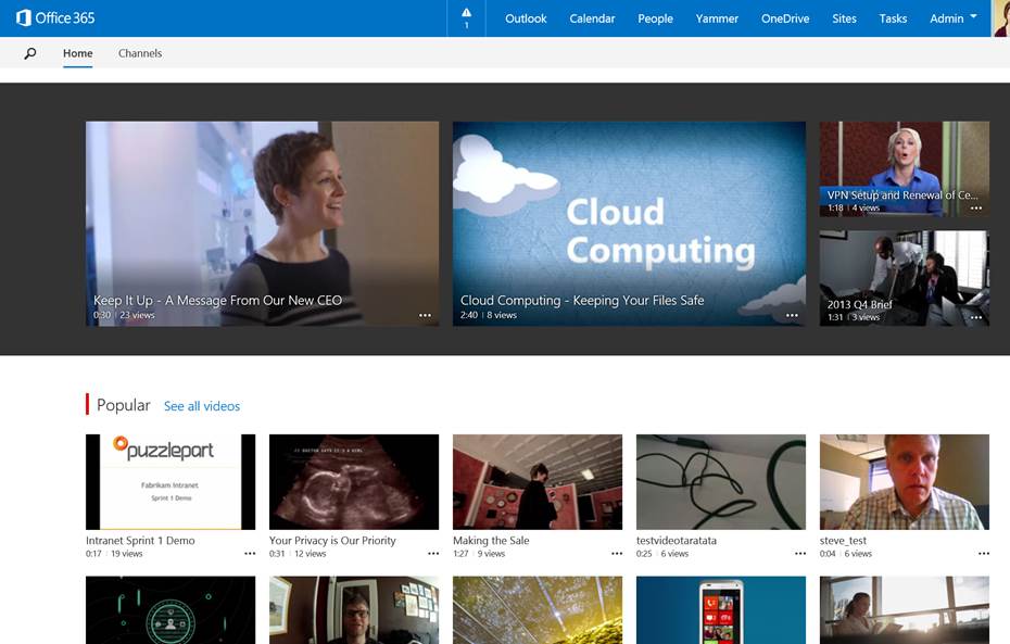 The NextGen Office 365 Video Portal, the first in the family of NextGen Portals, serves as an intranet solution to share videos, one of the most powerful forms of communication. It provides organizations with a secure, company-wide destination for posting, sharing and discovering video content. Think YouTube for the enterprise. The portal consists of two major components, the video portal (hub) and channels. The video portal (hub) is a high-level overview of all channels and videos inside your organization. Channels are where videos can be uploaded, categorized and shared with internal users. Multiple channels can reside within the video portal (hub). The architecture implementation for Office 365 Video Portal consists of SharePoint Online and Office 365 and the engine is powered by Azure Media Services and Office Graph. The portal initially rolled out to Microsoft's First Release customers in November 2014 and has since been deployed worldwide as of quarter two, 2015.