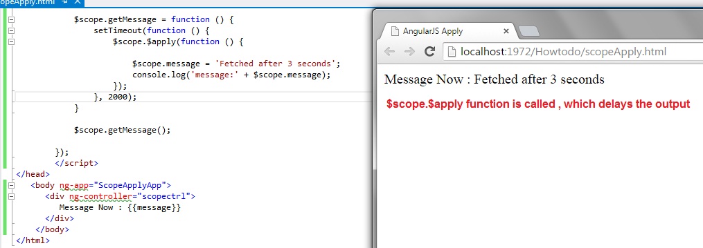 When you do the changes to scope inside your Angular code like within controllers or services, Angular internally call $apply() function for you. But when you do the changes to the scope outside the Angular code, you need to call $apply() function explicitly on the scope to force the model and DOM to be updated correctly.