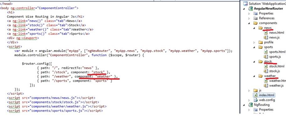 Here in { path: "/", component:"news" }, we should keep the folder components and inside components we will put news folder. News folder will contain the html and controller code for this view only.