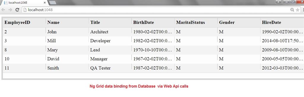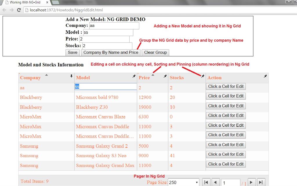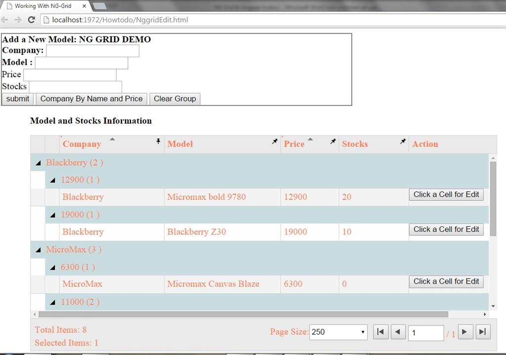 Now, we have seen data from the database and binding to an ng-grid. Let us see now what the features are in ng-grid to make it more useful. We will do a sample ng-grid binding, editing, paging, sorting and grouping the records.