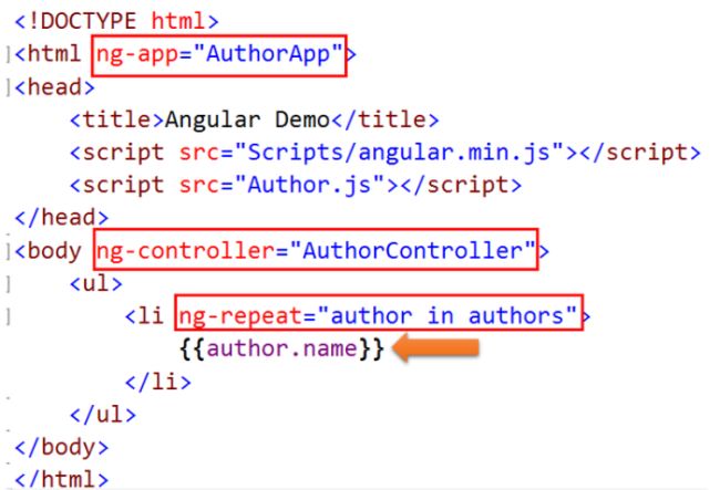 We created the AuthorApp module and AuthorController controller in Author.js. Now if you see we bind the view and controller in the following three steps:
