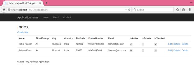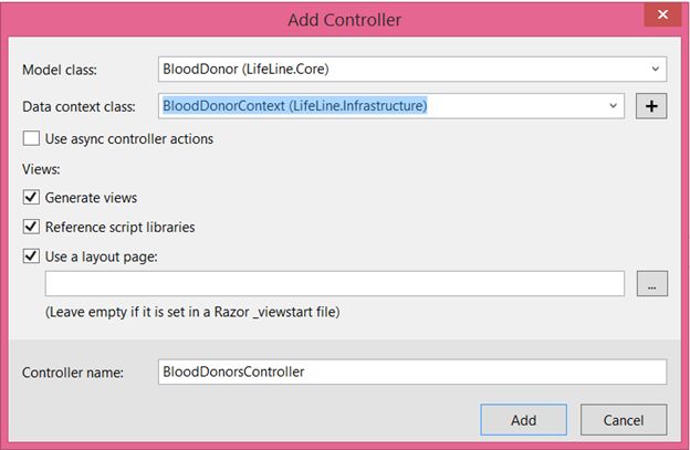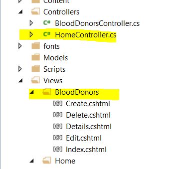 We have created the controller along with the view using the scaffolding. At this point if we notice the web project, we will find the BloodDonors controller and a BloodControllers subfolder in the view folder.