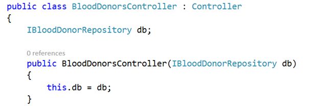 We have a running application but there is a problem. On noticing the controller class closely, we will find that the object of the data context class is directly created inside the controller. We used scaffolding to create the controller using the Entity Framework and it causes the creation of a data context object inside the controller. Right now the controller and the data context class are tightly coupled to each other and if we change the database access program then the controller will be affected also. We should not have the BloodDonorContext object inside the controller.