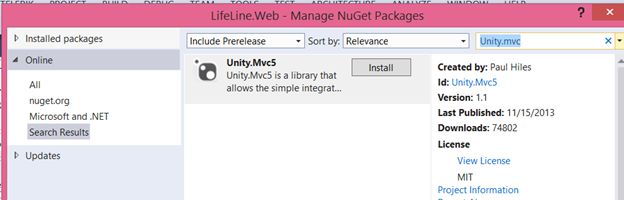 We will use the second approach. To use the Unity container add the Unity.Mvc5 package to the web project using Manage Nuget Package.