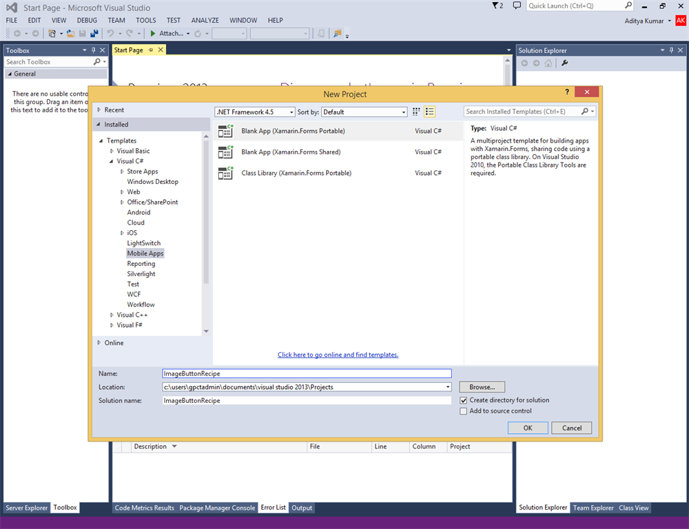 2. Select Mobile Apps from the installed templates of Visual Studio under C#. Now as you can see we have two options for a Blank App, one is Xamarin.Forms Portable and Xamarin.Forms Shared. We will be working on Xamarin.Forms Portable.