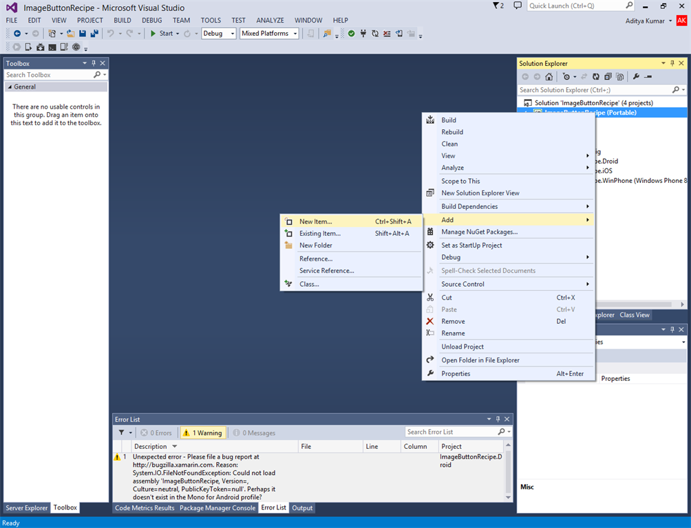 3. Now you can see that the solution file contains the 4 projects XamarinSample (Portable), XamarinSample.Android, XamarinSample.iOS and XamarinSample.WinPhone. We will now right-click on the first project, XamarinSample (Portable) and click on Add -> New Item from the context menu.