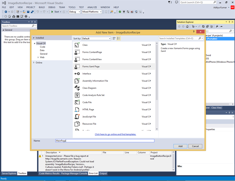 4. Now we will select Forms XAML Page from the dialog and name it.