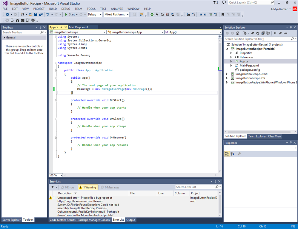 5. Once the Forms XAML Page is added to the project, open the App.Cs and write the following code in the constructor: