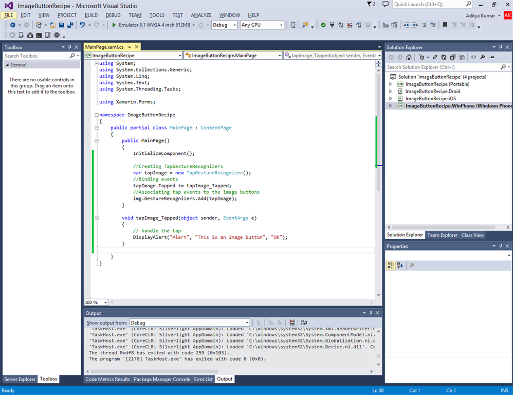 7. Now we will write the Tap Gesture Recognizers code in MainPage.xaml.cs as in the following: