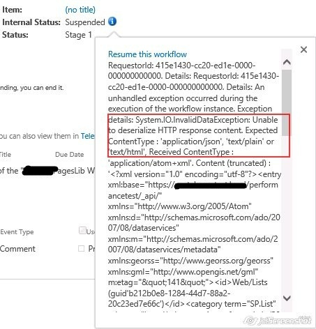 When working on one of the workflow development tasks, it was required to have a web service call to fetch data from SharePoint. To do that I used a "Call HTTP web service" action but with that I was getting the following exception “Unable to de-serialize HTTP response content. Expected Content Type: 'application/json', 'text/plain' or 'text/html'”.After struggling with this issue, the solution I used thought to share the solution with the developer community.Solution: The reason for the issue is, by default response from SharePoint REST is in XML and the SharePoint designer workflow is not able to parse the XML and needs a JSON response. To resolve this issue we need to pass Accept and Content-Type as application/json;odata=verbose to request the headers. This way we will get a JSON response. To resolve this use the following procedure.
