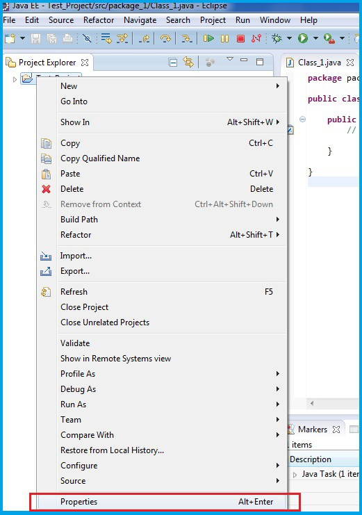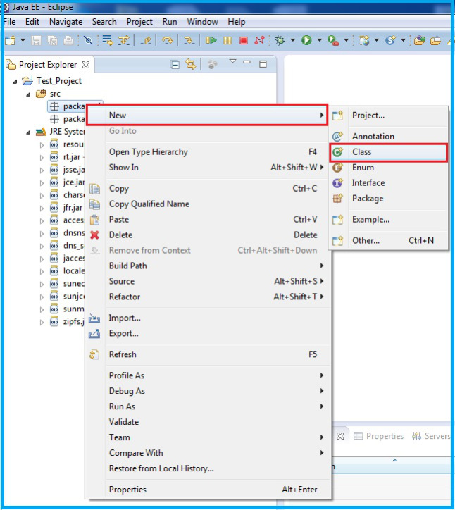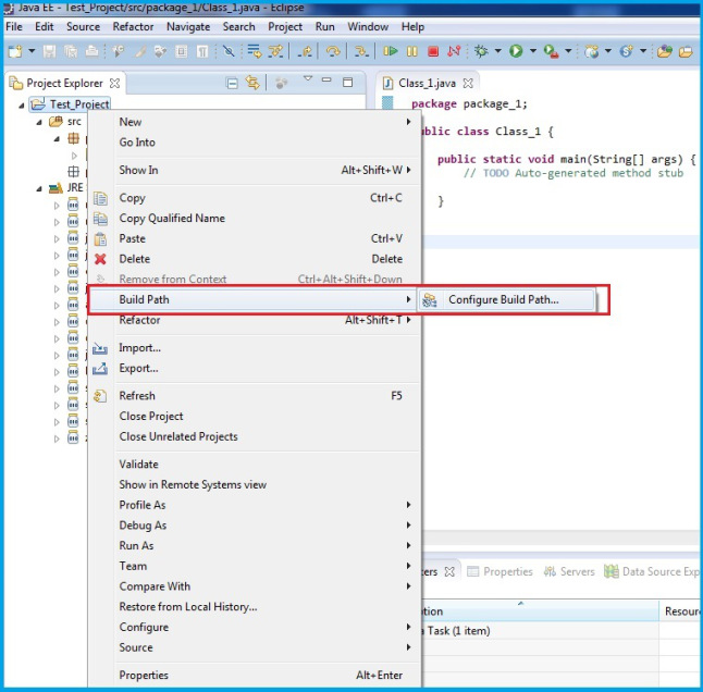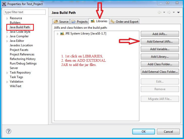- Now Configure the JAR files that have been downloaded in Step 3. For adding the JAR files into the project, right-click on the project, "Test_Project" then select Properties then select Java Build Path present on the left column then seelct the Libraries Tab then click on the Add External Libraries button.