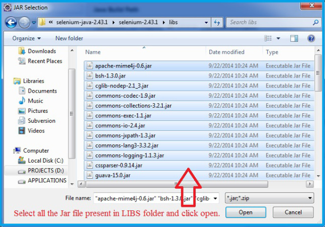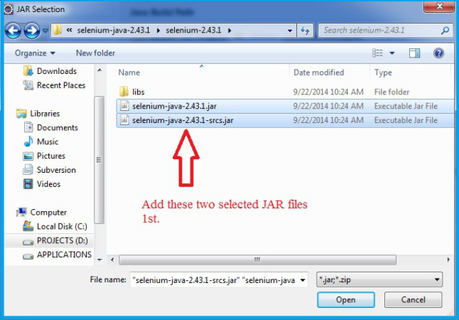 - Now go to the folder where you have extracted the JAR files. Select the two JAR files present in the folder "selenium-2.43.1". Now click on Open.