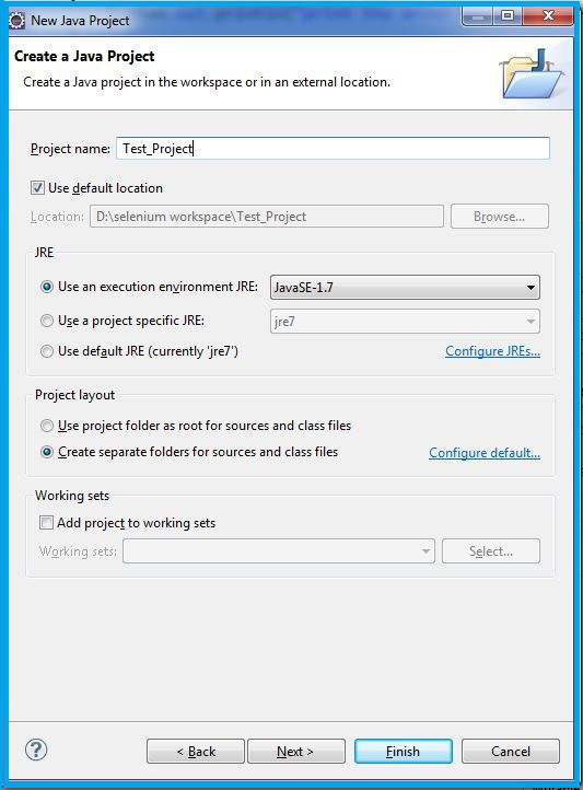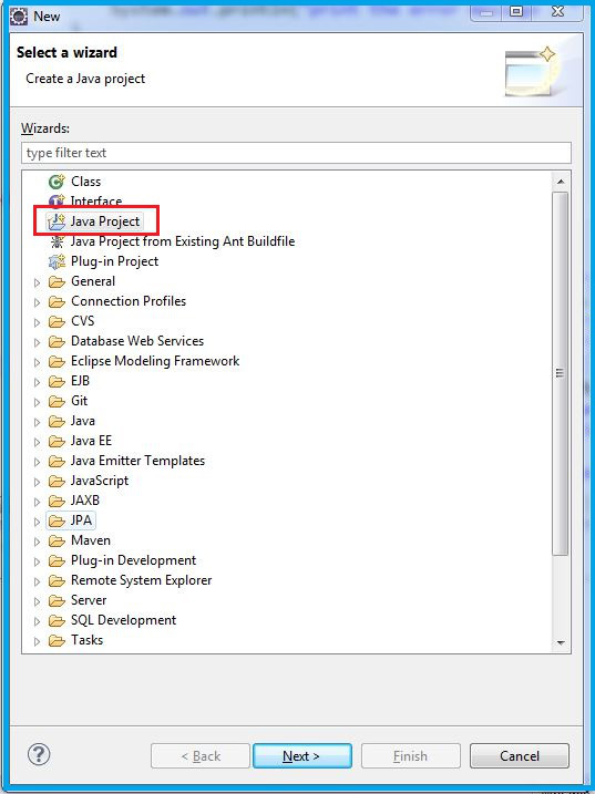 - Now we create a new Java project. "File -> New -> Java Project" or "Ctrl+N" then select the Java Project then click Next then provide a project name then click Finish.