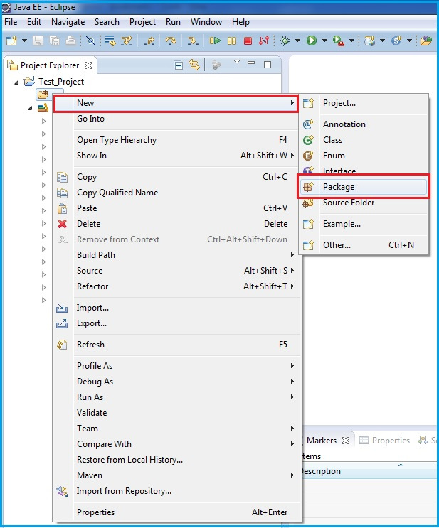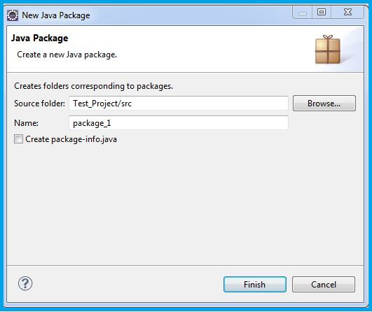 - Now create a Package. For package creation, right-click on the src of Test_Project then click New -> Package and name that package package_1 and click on Finish.
