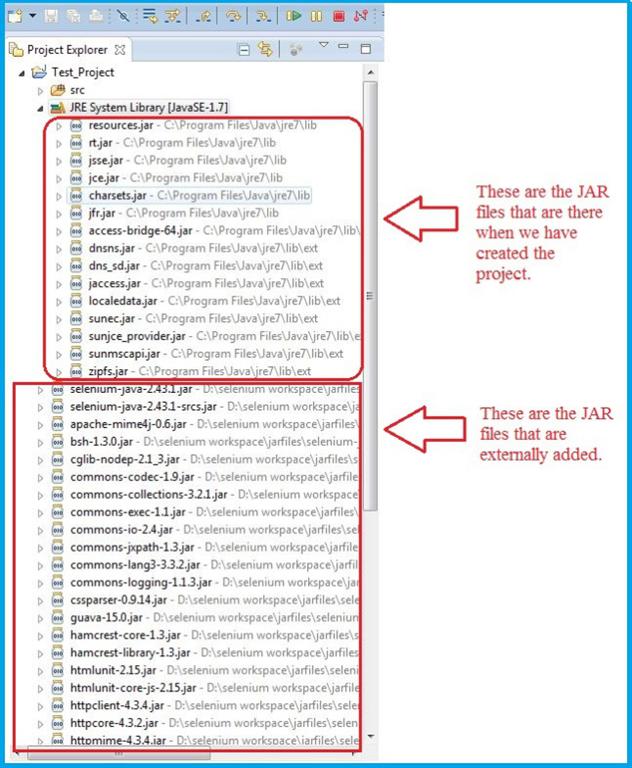 - Now all the JAR files are added under the JRE System libraries. Here is a view of the structure.