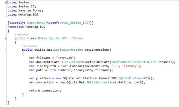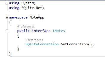 Here we want to use dependency services to define the path or location for our database to be saved and for the SQLite connection. For that I have created an interface "INotes.cs".