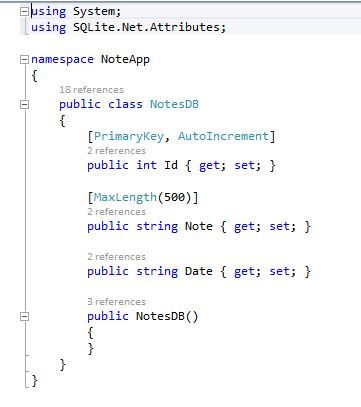 Now we can create a model in our shared project named "NotesDB.cs".
