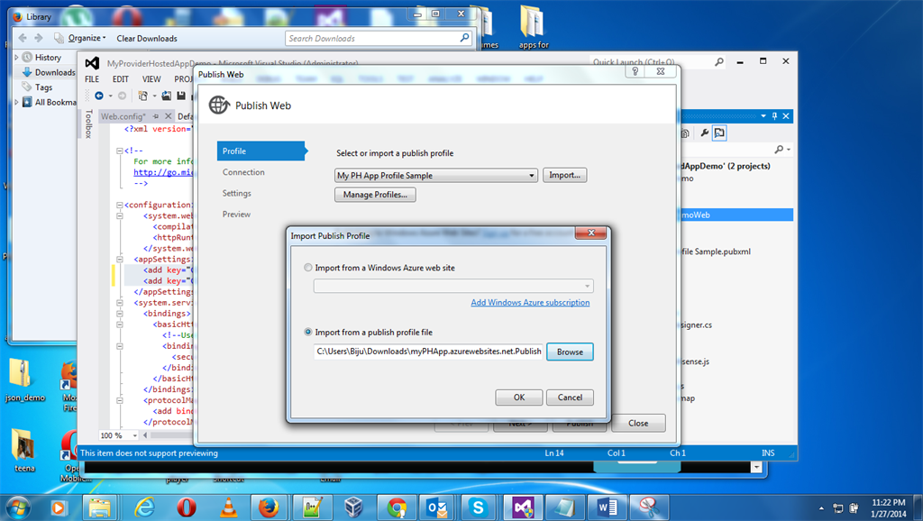 Step 11: Create the publishing profile providing the Azure site name, Client Id and Client Secret as in the following: