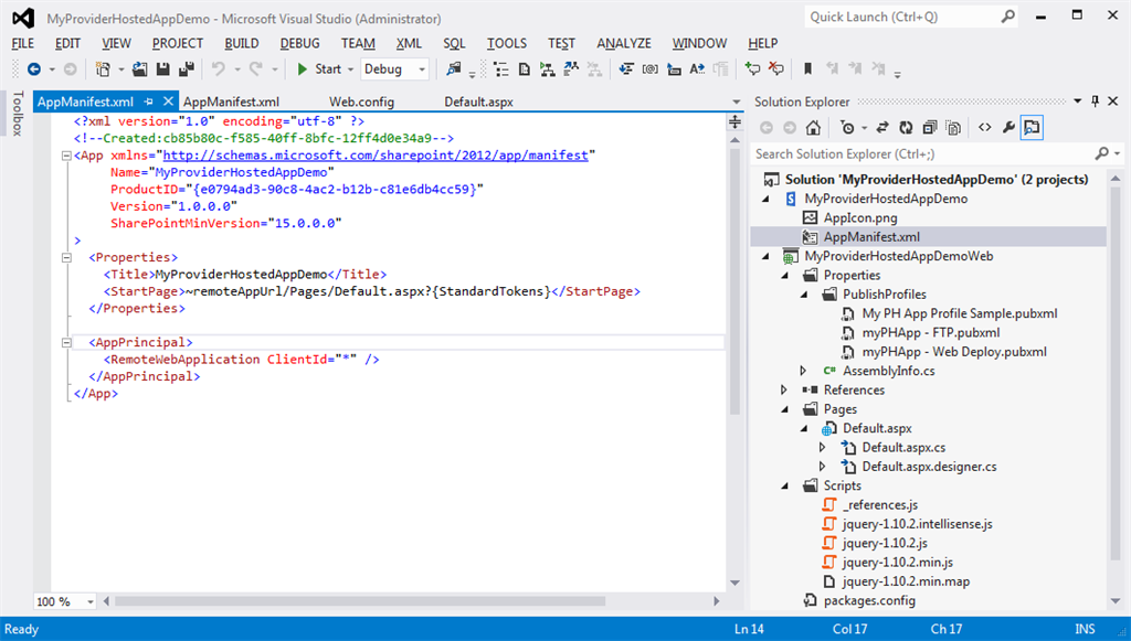 Step 4: Click "Finish" and the project is created for you by Visual Studio. You can see two projects created under the solution. The first project consists of just an app icon and AppManifest.xml that manages all the settings like start URL, permission, Query strings, Client ID, Tokens and so on.