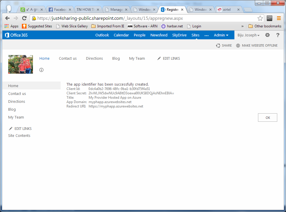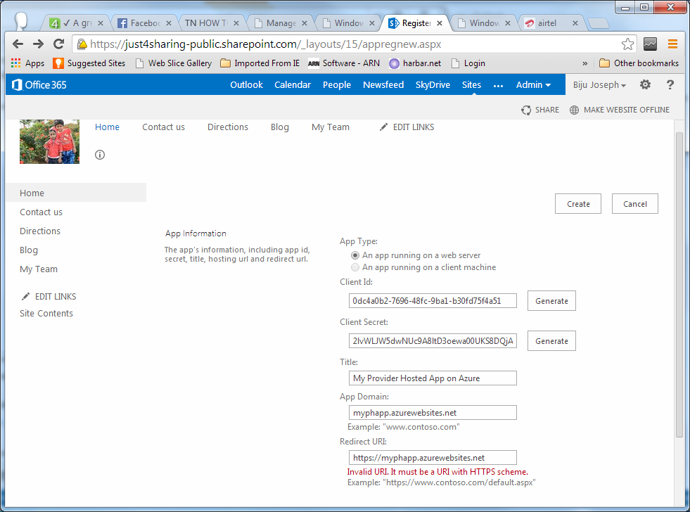 - Go to the “/_layouts/15/appregnew.aspx” page of your SharePoint site (in my case, it is just4sharing-public.sharepoint.com) to generate the client Id and client secret id.