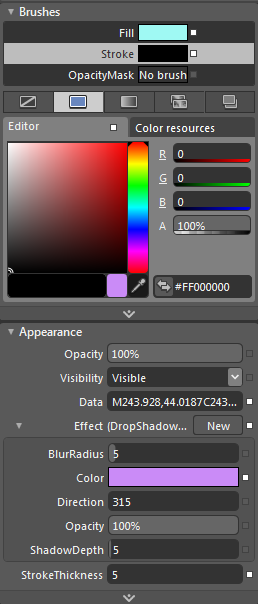 Again select an Ellipse Shape, draw an Ellipse (Handler), manage Width & Height, Color, Stroke, StrokeThickness and DropShadow Effect from Brushes and the Appearance Property of the Property Panel located to the right of the Workspace as shown below: