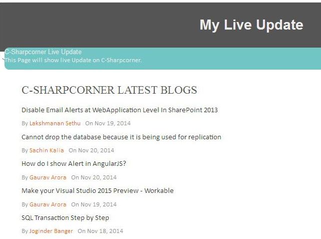Wow, we did it. Now we are getting the live update of C# Corner in our page. For a better understanding of this download the source code is attached with this article.